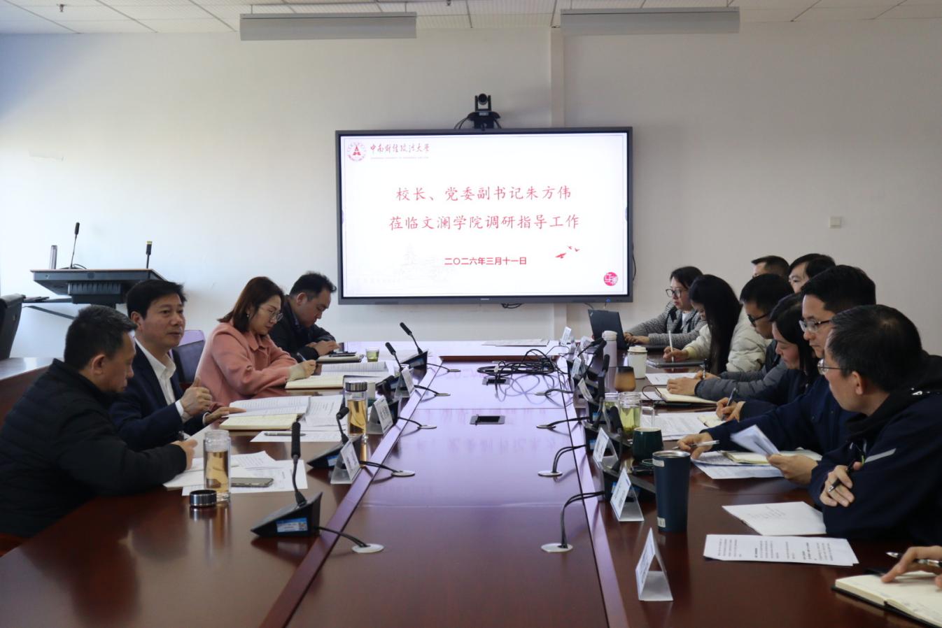(通讯员/周思琪 祖宝璐)3月11日,校长、党委副书记朱方伟莅临文澜学院,调研指导学院改革发展及“十五五”规划编制工作。政策研究与法治办公室副主任万思露陪同调研,文澜学院领导班子、行政主管、科室负责人及部分专任教师代表参加座谈,座谈会由学院党委书记彭晓燕主持。