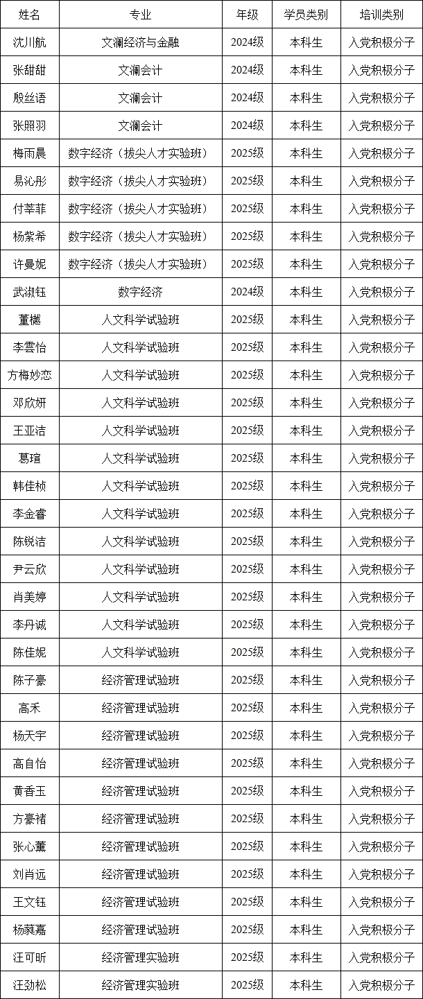 根据上级党委组织部门关于发展党员工作文件的规定,经个人申请、入党谈话、团组织推优等环节,文澜学院各团支部于2026年4月8日召开会议讨论通过,确定沈川航等同志为入党积极分子,予以公示。现对沈川航等同学在理想信念、政治立场、思想作风、工作、学习、群众观念及廉洁自律等方面接受广大党员、群众监督。